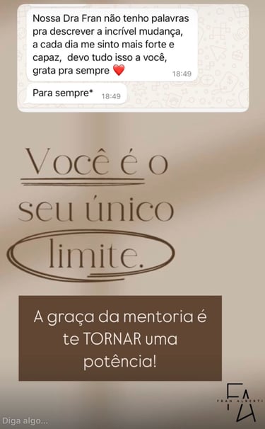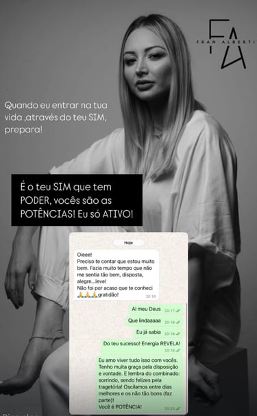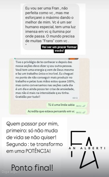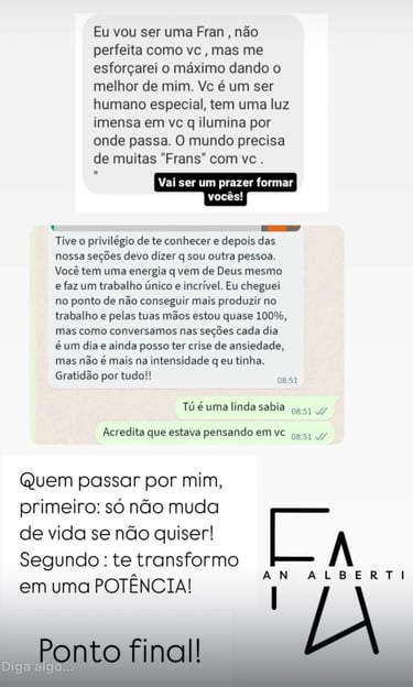 Sou Fran Alberti, gestora de emoções, terapeuta integrativa, escritora, professora e mentora, com formações nacionais e internacionais e mais de 20 anos de experiência, conduzindo mais de 50 mil transformações.